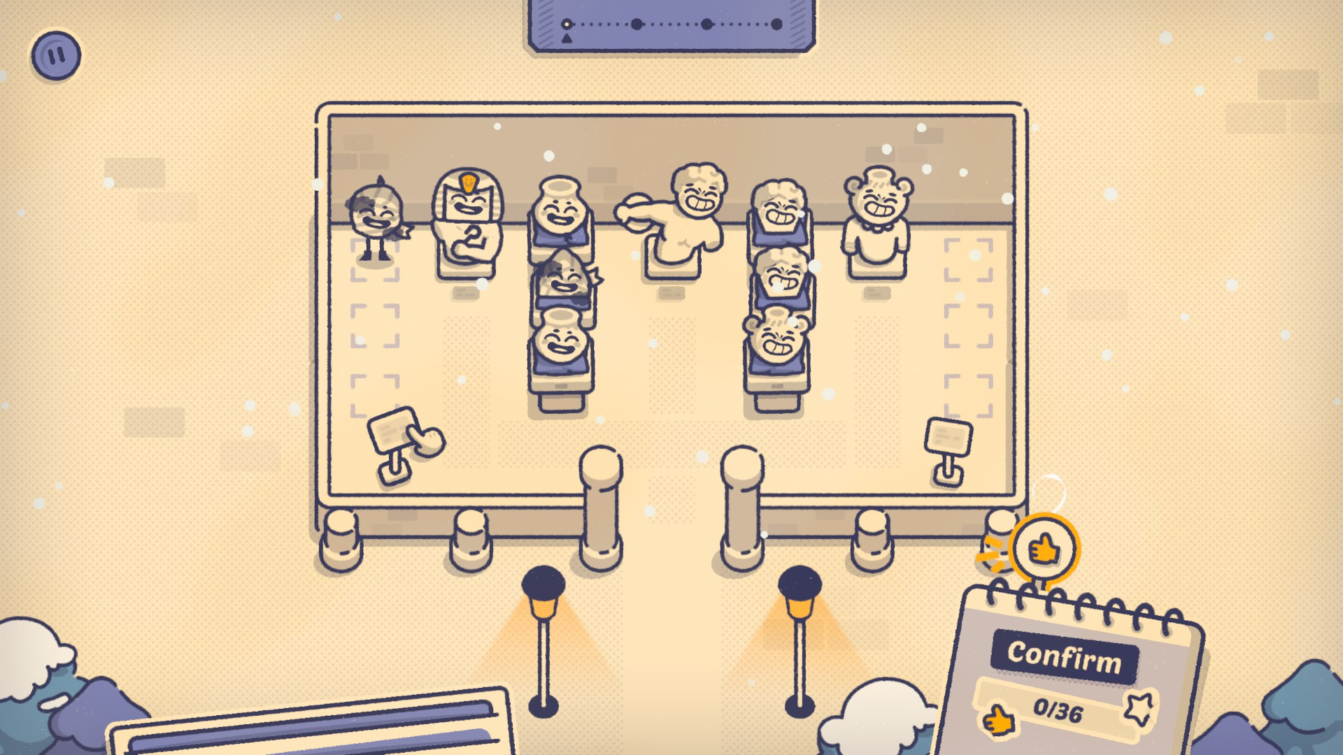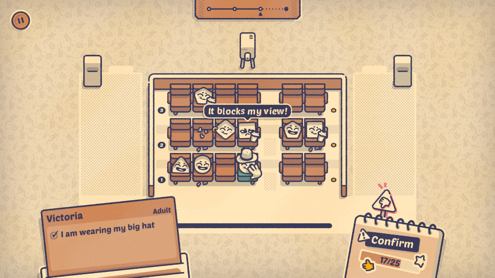 Is This Seat Taken? is a cute and relaxing logic-style puzzle game. It’s a relatively simple idea—every level will have a group of characters who all have one to three different demands that need fulfilled. To complete a level you need to position each person (or more accurately—each shape) somewhere in the scene where all of their criteria can be met simultaneously.